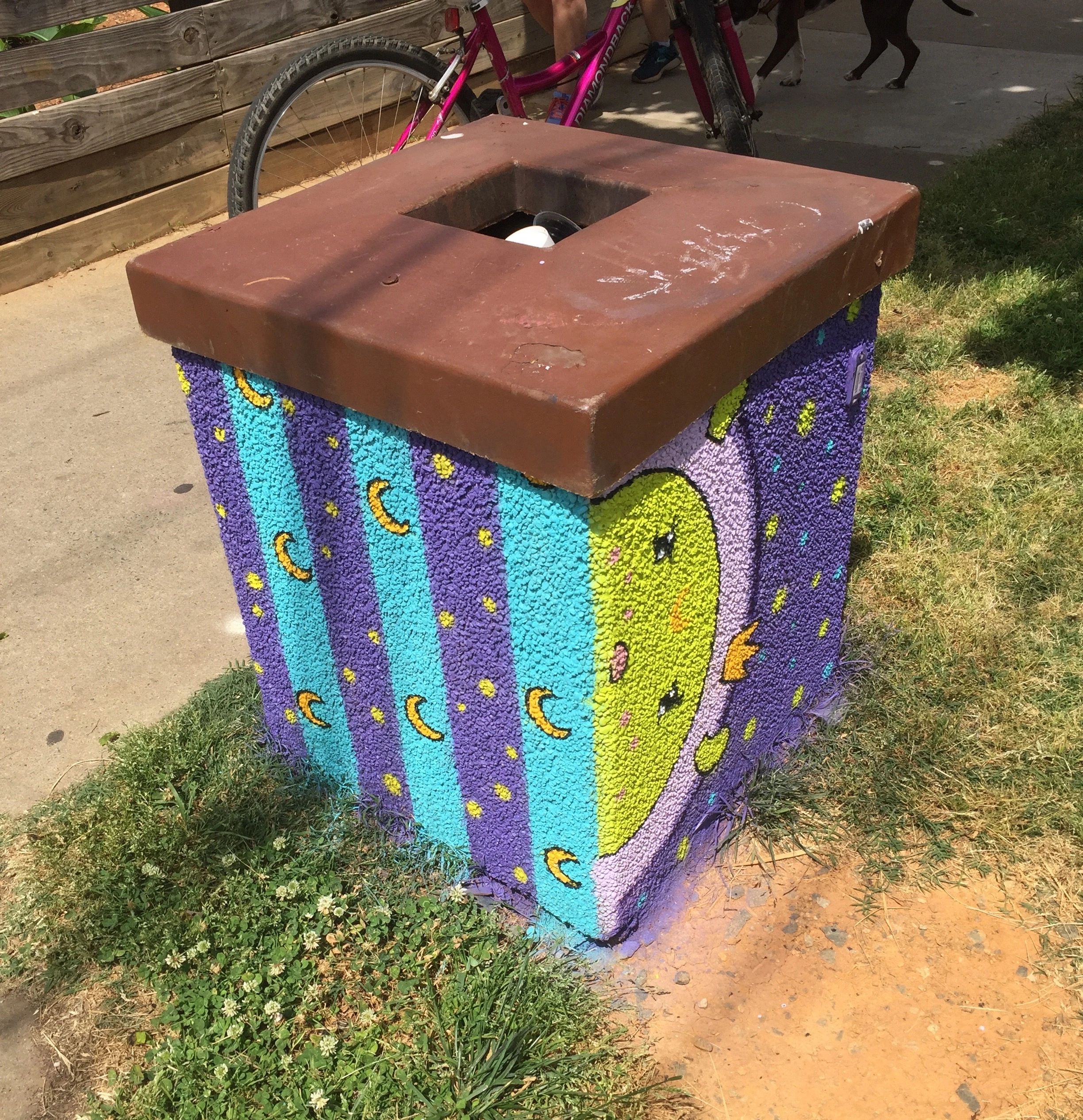 Story: NoDaRioty, the arts committee for the Historic North Charlotte Neighborhood Association, partnered with the City of Charlotte and the Neighborhood Matching Grants Program to committee artists to design existing trash receptacles. A telephone call to artists was sent out and eight artists were chosen to produce their designs.
