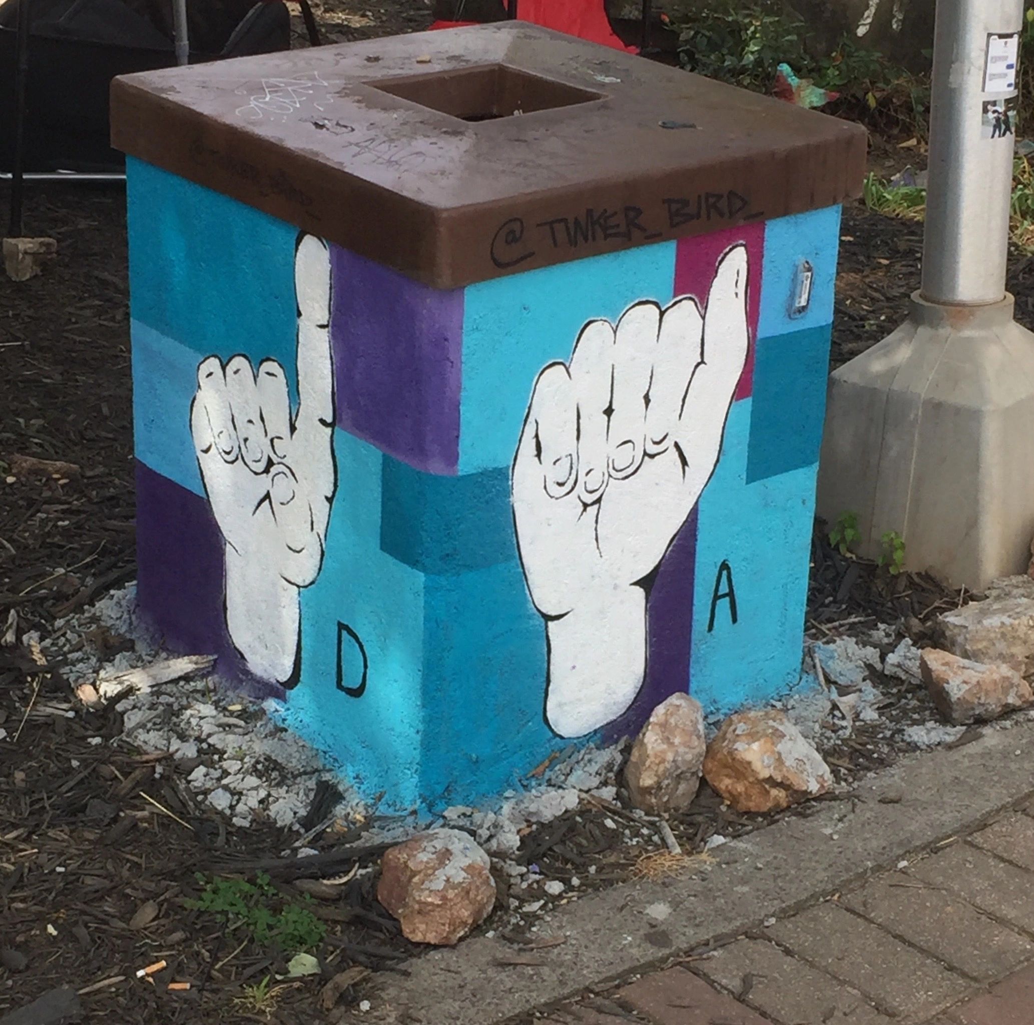 Tinker Bird placed the messages N-O-D-A in both English and American Sign Language on his trash receptacle. Self-described tinkerer, creative person, and carpenter, he draws his influences from street fine art, skate civilisation and his time in a ring. His bulletin is meant to "gloat diversity and inclusiveness."