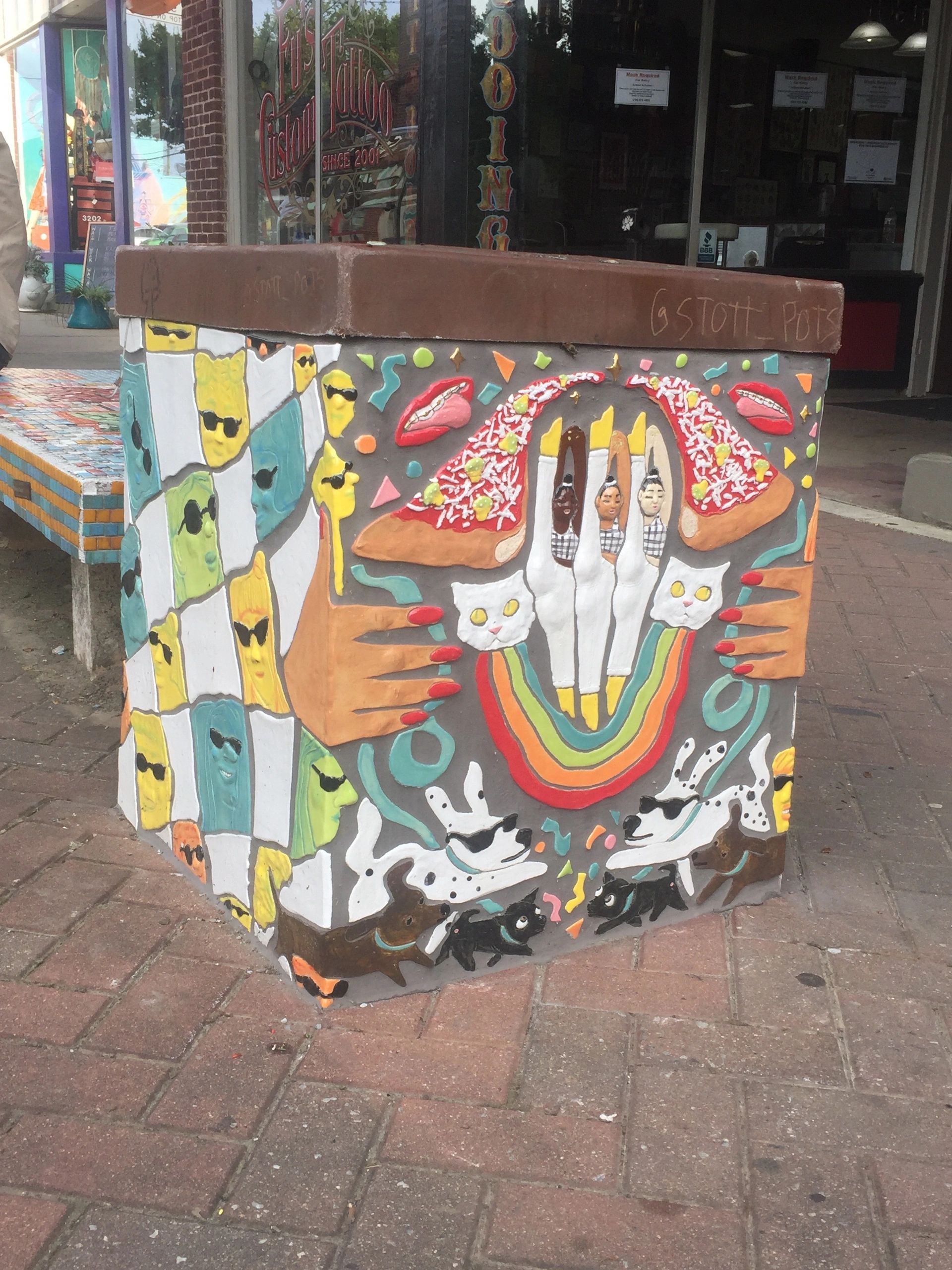 Artist Grace Stott places ceramic faces on three sides of the receptacle and adds lots of colorful neighborhood connections on the fourth side. Be on the lookout and see if you can find all eight in the concern district.