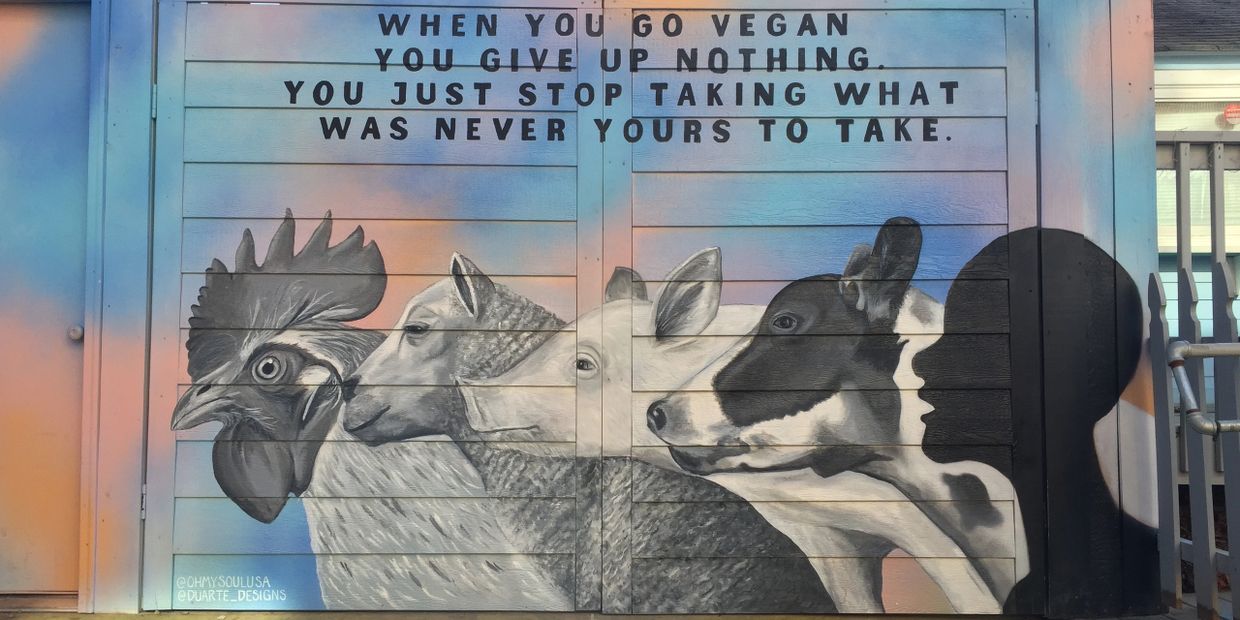 Veganism seeks to promote a way of life and living philosophy that excludes all forms of cruelty or exploitation to animals. So, gloat the chicken, the lamb, the pig and the cow rendered in the same scale as the solid human being profile. Duarte Designs always brings the viewer those letters of positivity and reflection!