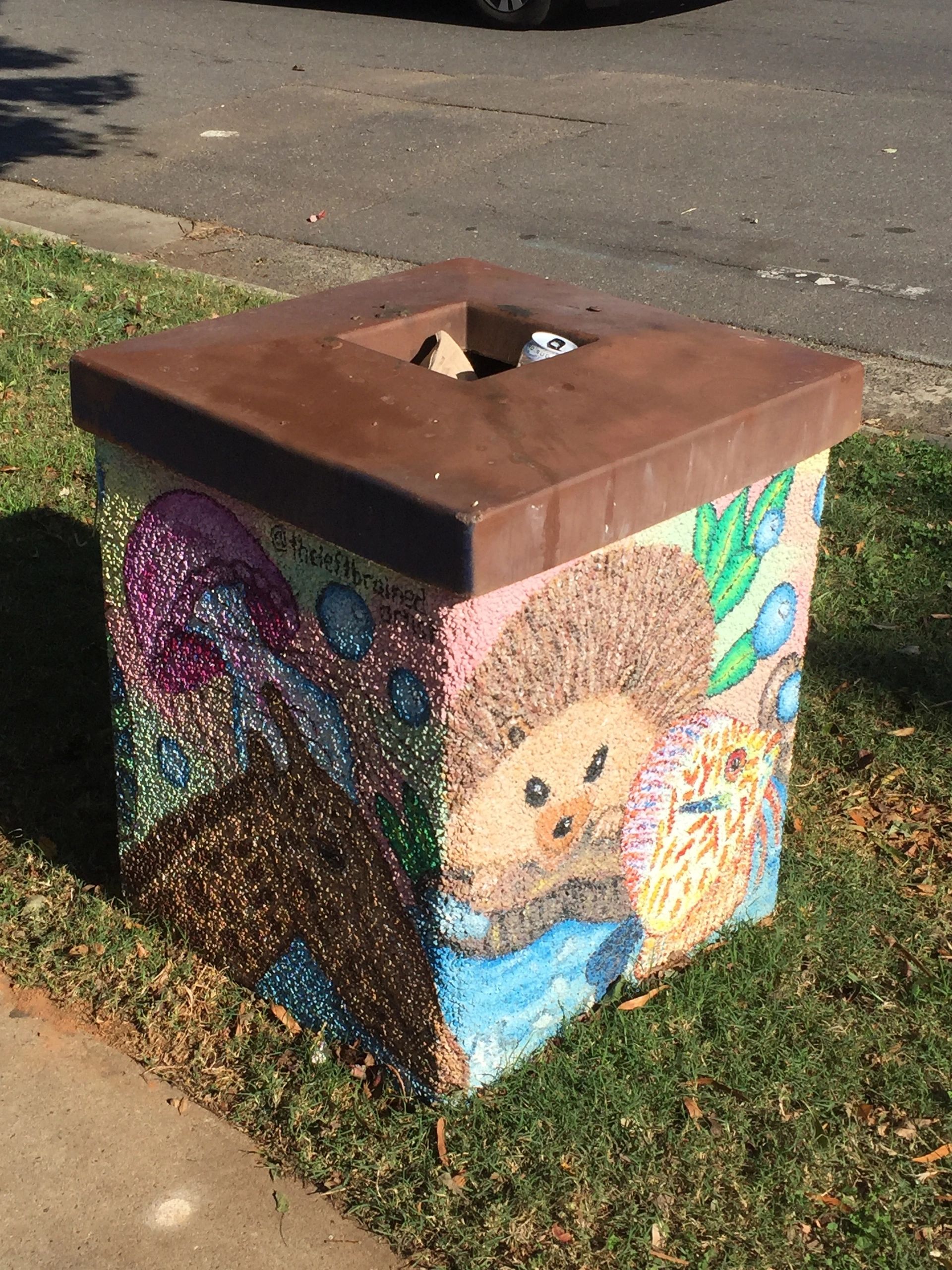 Story: NoDaRioty, the arts committee for the Historic North Charlotte Neighborhood Clan, partnered with the City of Charlotte and the Neighborhood Matching Grants Programme to commission artists to blueprint existing trash receptacles. A call to artists was sent out and 8 artists were chosen to produce their designs.